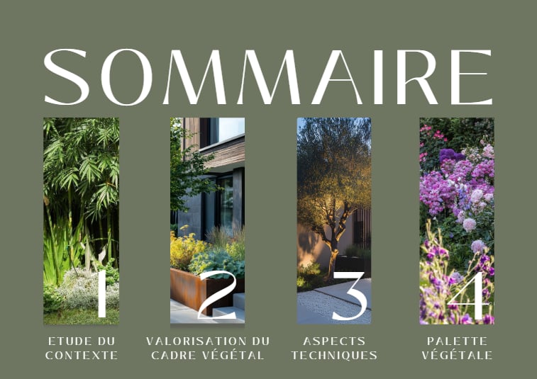 Nous présentons un dossier d'études présentant une proposition d'aménagement, présentée sous la forme d'un plan, d'une maquette, d'illustrations, d'exemples d'images et de palettes de matériaux, le tout vous permettant de visualiser l'aspect de votre nouveau jardin.